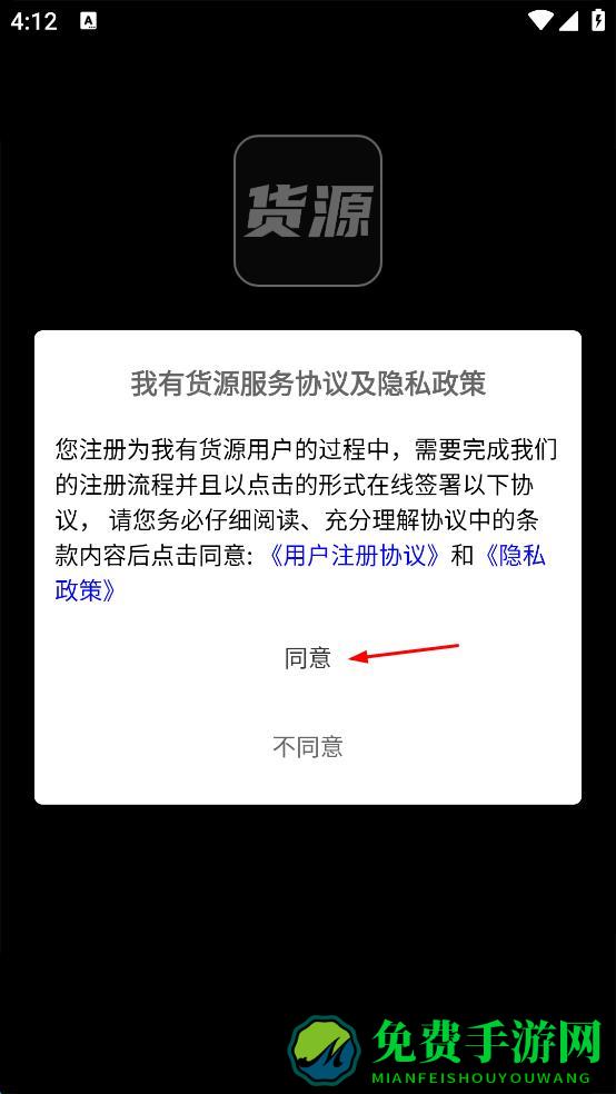 1、打开我有货源App,出现服务协议及隐私政策弹窗,阅读后点击同意按钮。