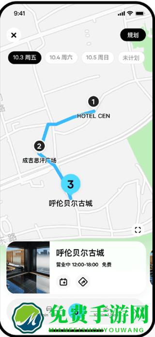 3、集成实时交通,清晰显示地点之间的路程用时,让行程更加完善。