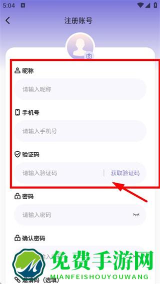 3、在注册账号信息填写页面,输入昵称、手机号,获取并输入验证码。