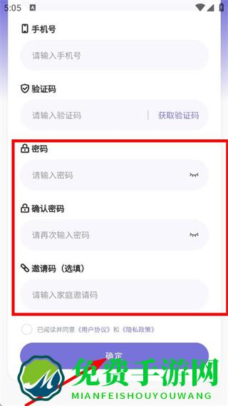 4、输入密码、确认密码,选填邀请码,勾选协议后,点击确定,完成注册。