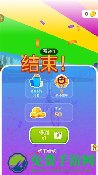 4、到达终点后,查看排名、超车数量和奖励,点击点击继续进入下一场景。