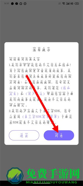 1、打开中国药典,在温馨提示弹窗中点击同意。