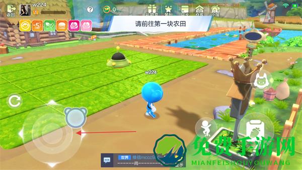 1、进入游戏,看到提示请前往第一块农田,点击屏幕虚拟按键操控角色移动。