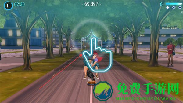 滑板操控与躲避操作逻辑简单,通过基础按键或滑动即可完成,新手也能快速适应,专注剧情与冒险。