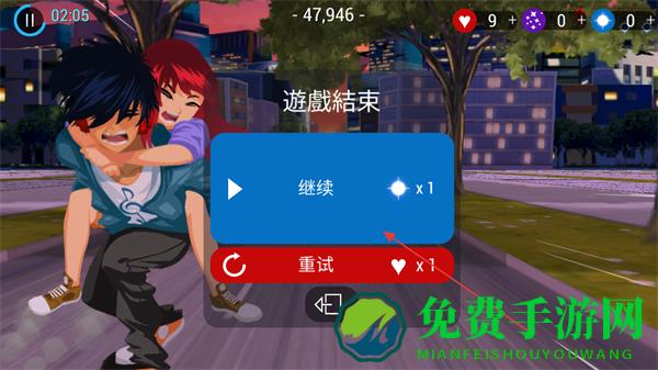 4、若游戏结束,出现遊戲結束界面,点击继续消耗钻石续关,或点击重试重新开始游戏。