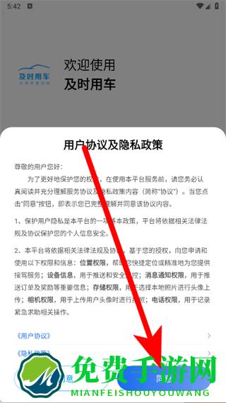 1、打开及时用车,在弹出的窗口中,认真阅读协议内容后点击同意按钮。