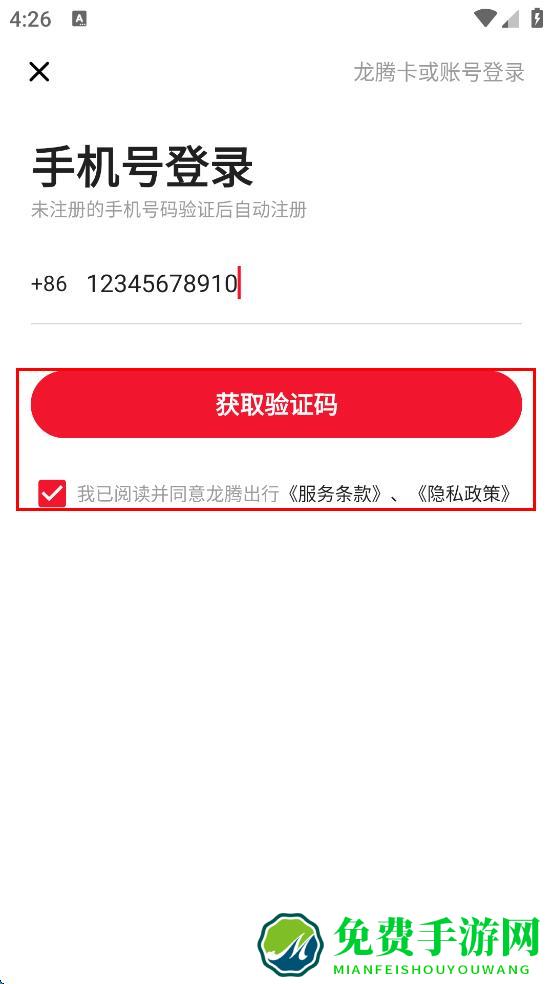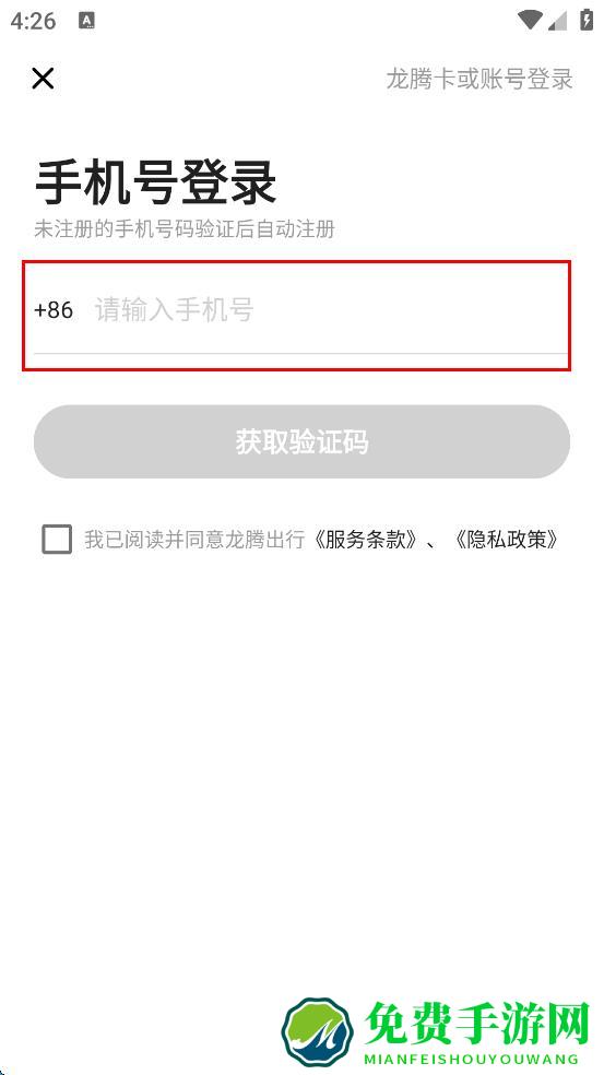 3、进入手机号登录页面,在输入框输入手机号,勾选同意政策,点击“获取验证码。