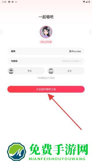 2、登录后,会弹出头像与昵称的设置,用户可任需设置,设置后点击开启我的唱吧之旅即可进入到首页。