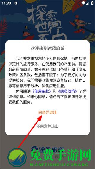 1、在欢迎来到途风旅游弹窗中,点击同意并继续,进入主页面。