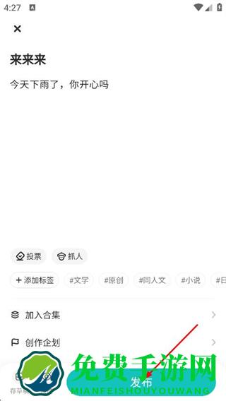 3、在文字编辑页面中,输入你想要发布的文字内容,还能添加投票、抓人,添加标签等,完成后点击底部的发布按钮。