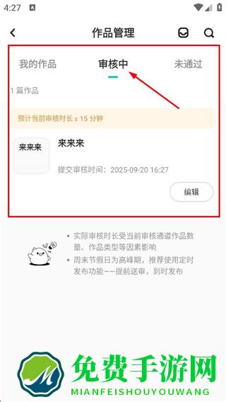 4、发布完成后,点击我的,找到作品管理,点击审核中栏目,即可查看发布作品的审核状态。