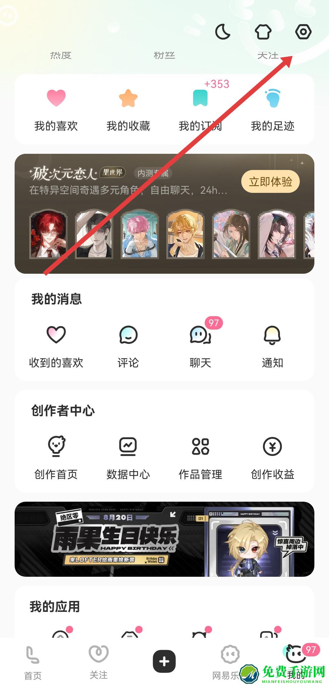 1、打开LOFTERAPP,点击底部导航栏我的进入个人中心,再点击页面右上角齿轮形状的设置图标。