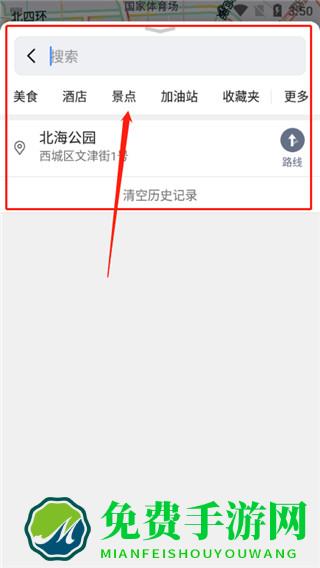 3、你还可以在搜索栏中,了解附近的美食、酒店、景点以及加油站等等;