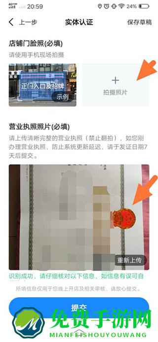 4、拍摄店铺门脸,上传营业执照照片即可。