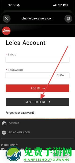 3、在Leica Account界面,点击REGISTER HERE按钮进入注册页面。