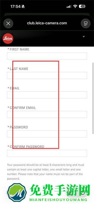4、在注册页面,依次填写FIRST NAME、LAST NAME、EMAIL、CONFIRM EMAIL、PASSWORD、CONFIRM PASSWORD等信息,完成徕卡账号注册。