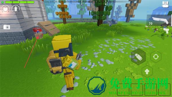 1、在方块世界中移动,切换武器如手枪,探索房屋、树林等区域,寻找资源和敌人。