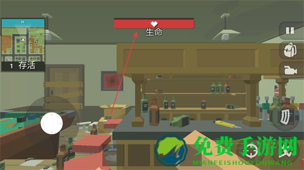 1、注意上方的生命条,在场景中搜索武器、道具,提升生存能力。
