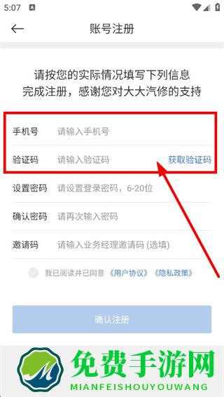 3、在账号注册页面,输入手机号,点击获取验证码,输入验证码。