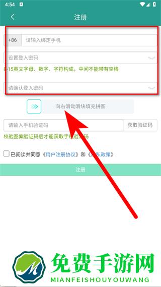 3、输入绑定手机号码,设置登录密码并确认,向右滑动滑块完成拼图验证。