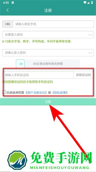 4、点击获取验证码,输入收到的手机验证码,勾选同意后,点击注册按钮,完成账号注册。