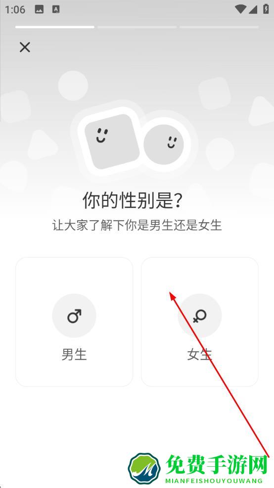 1、选择性别:在性别选择页,点击男生或女生,选定自身性别。