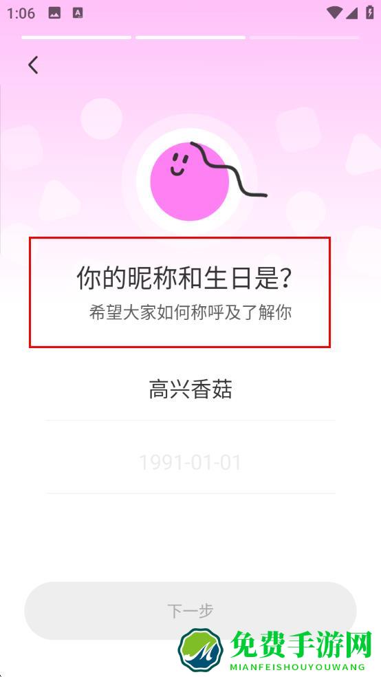 2、填写信息:进入昵称和生日填写页,输入昵称,补充生日日期,填好后点下一步。