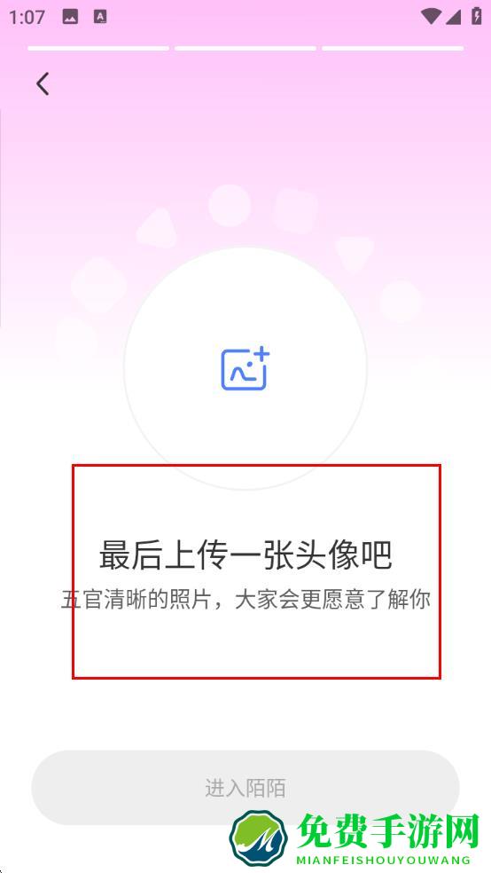 3、上传头像:在头像上传页,点击头像上传区域,选择一张五官清晰照片作为头像,完成后点进入陌陌,即可完成注册信息完善。