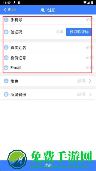 2、在用户注册页面填写手机号,点击获取验证码并填入,输入真实姓名、身份证号、E-mail。