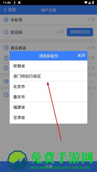 4、选择所属省份,例如北京市、安徽省等。填写完成后点击注册。