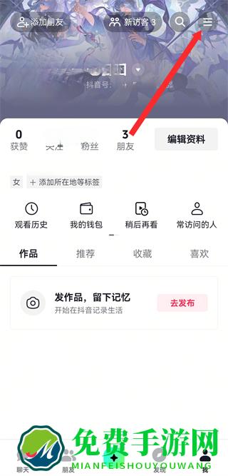 2、在个人的页面,点击右上角三条横线图标,展开功能菜单。