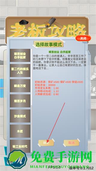 1、选择故事模式,如艰苦创业白手起家,了解背景故事和初始资源,点击确定开始游戏。