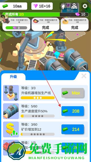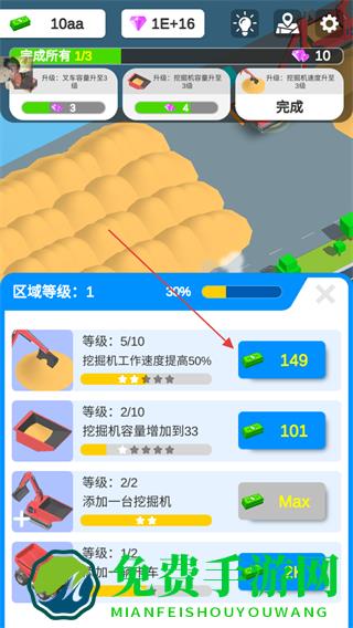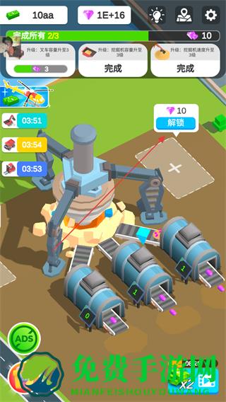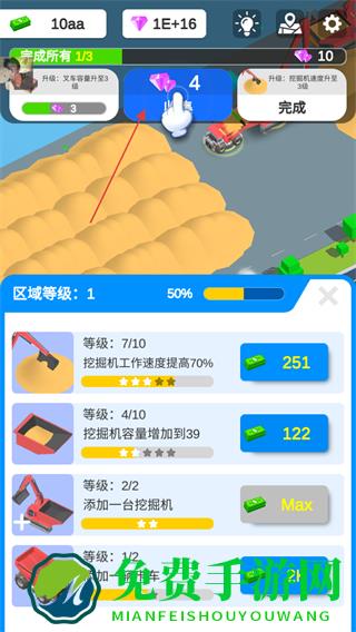 1、花费金币升级挖掘机,如提升工作速度,增加区域等级进度,同时可领取钻石奖励。