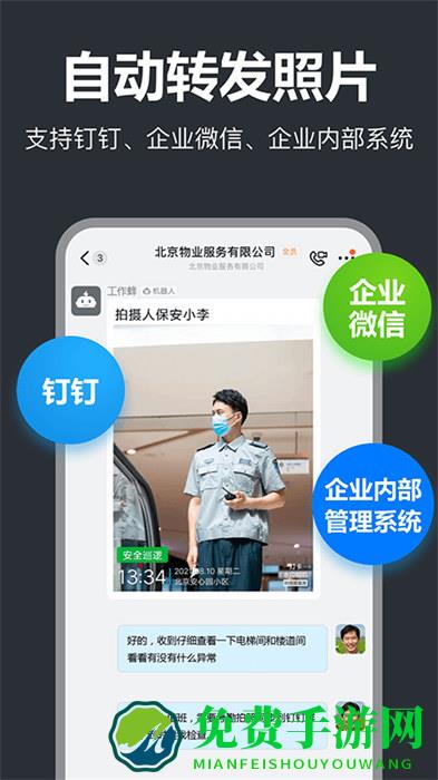 团队拍照上传至团队,可以自动转发至公司钉钉群、企业微信群,工作蜂水印相机支持绑定公司内部管理系统,同步工作照片。