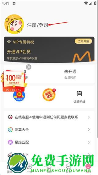 2、在个人中心点击注册/登录,进入账号登录界面。