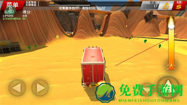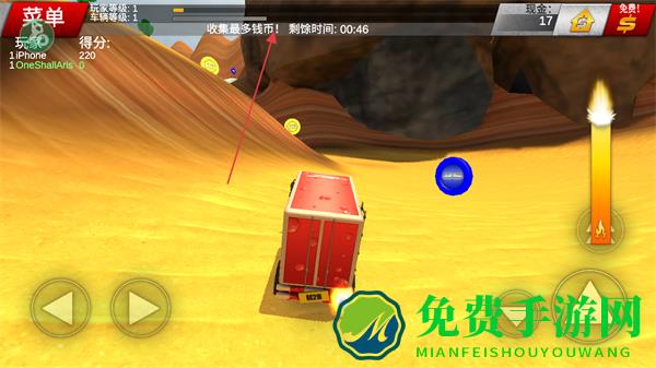4、在规定时间内,驾驶车辆在沙漠中快速移动,收集更多钱币,完成任务目标。