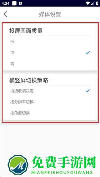 3、在媒体设置里可调整投屏画面质量为低、中、高选项。