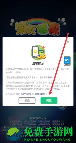 1、在消灭糖果的“温馨提示”弹窗点击“同意”,进入登录方式选择页面。