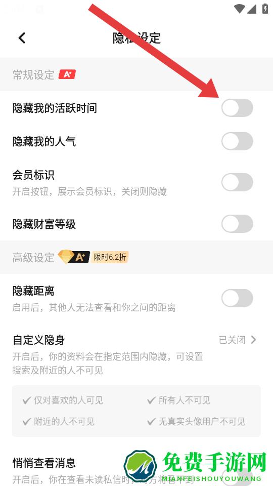 4、在隐私设定页面的常规设定区域,找到隐藏我的活跃时间选项,点击开启隐藏活跃时间。