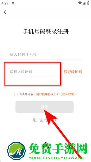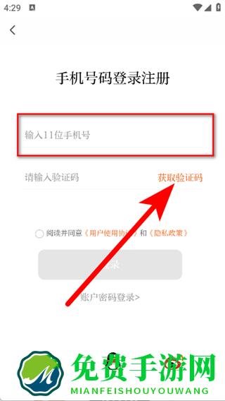 3、在登录注册页面,输入11位手机号,点击获取验证码。