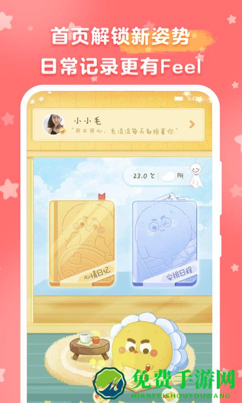 毛滚滚日常app让你可以方便在手机上写日记,这款软件可以很好的保护你的隐私,还拥有便签、备忘录功能,让你可以不会忘记重要的事情,有需要的用户赶快来下载体验吧!