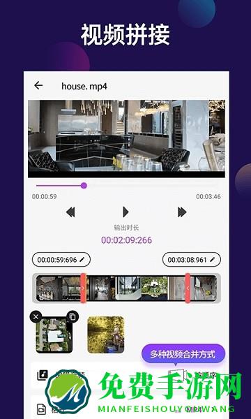 可以实现多个视频合并拼接, 并且可以实现并排、按顺序、上下等多种视频拼接方式,同时可以调整视频画质、视频宽高比、视频分辨率等。