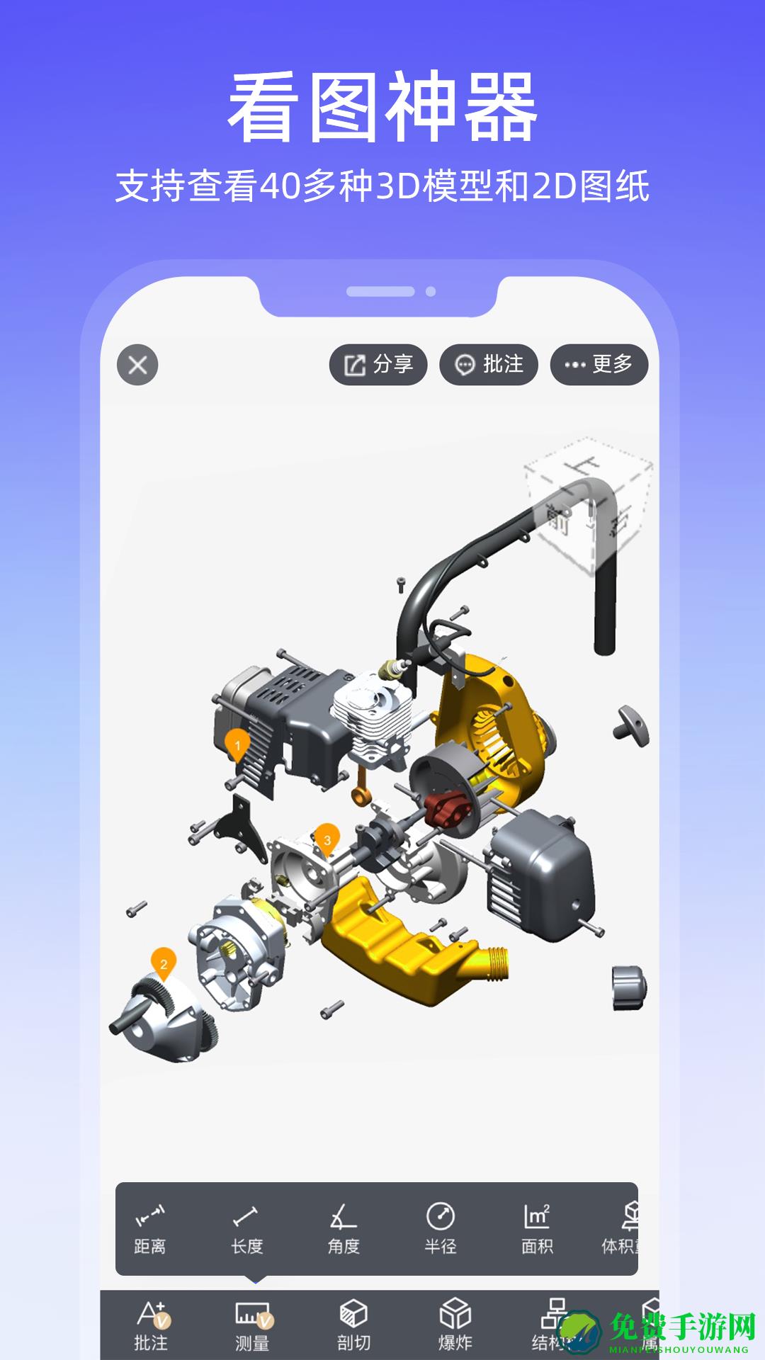 手机看图支持手机浏览30多种3D模型和2D图纸,提供视角、剖切、结构树、测量、PMI、爆炸、透视、拖拽、平移、缩放、旋转等。