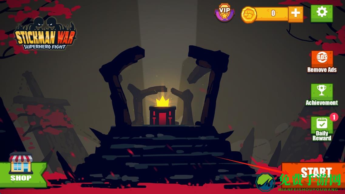 1、进入Stickman War,点击START,选择英雄,开启火柴人格斗冒险,点击开始游戏。