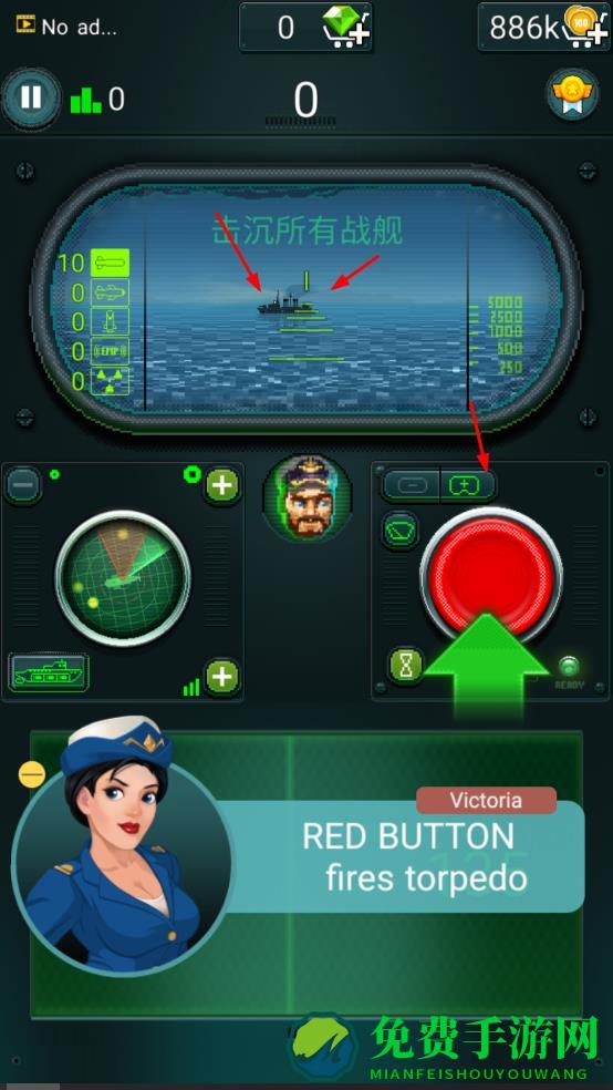 1、进入游戏后在潜艇操控界面,依据提示点击红色按钮发射鱼雷,目标是击沉所有战舰,开启海战任务。