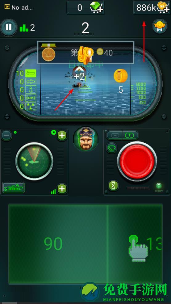 2、发射鱼雷命中战舰后,可获取金币等奖励,同时借助雷达等装置观察战场态势,掌握敌方战舰位置。