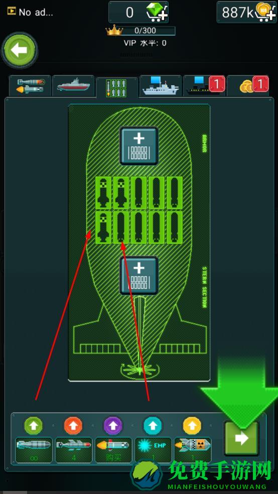 3、战斗间隙可进入潜艇内部界面,查看鱼雷等武器配置,还能开展武器升级等操作,强化潜艇战力。