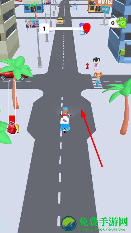 1、进入关卡,操控车辆朝红心目标行驶,查看左侧的油量条,在路口时候,需要避开车流,等斑马线行人通过,保持方向稳定,规划首段送货路线。