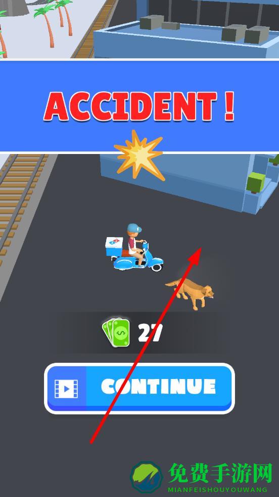 3、若失误,碰撞障碍物或动物,弹出事故界面,可选择看广告续关,或重新挑战,积累金币解锁新车。