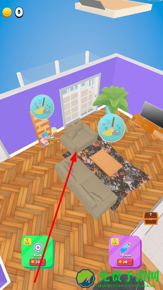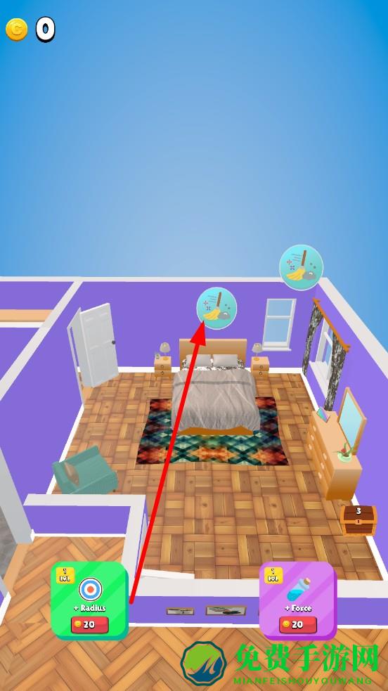 1、进入游戏选择待清洁房间,点击悬浮的扫帚图标进入清洁模式,观察房间布局,标记床、沙发等清洁区域,规划清理顺序。